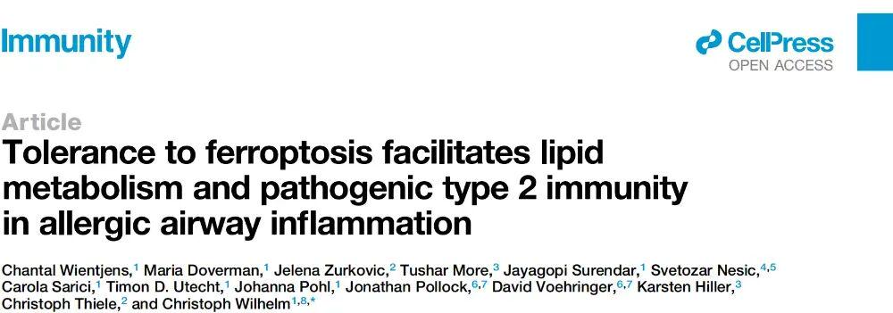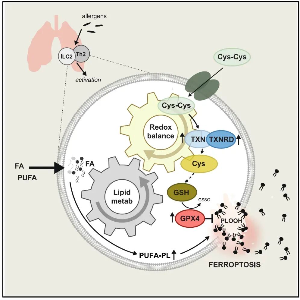 Immunity杂志发表了题为Tolerance to ferroptosis facilitates lipid metabolism and pathogenic type 2 immunity in allergic airway inflammation的研究文章, 系统揭示 了 过敏性气道炎症中ILC2代谢重构的核心逻辑:致病性ILC2通过增强胱氨酸依赖的GSH合成,并同步上调GPX4与TXNRD1,建立高度的铁死亡耐受,使其能够在炎症组织中大量摄取和使用PUFA以维持扩增与效应功能。铁死亡耐受不仅是其致病性的基础,同时也是可药物利用的代谢弱点,为哮喘等2型气道炎症提供了新的干预思路 。