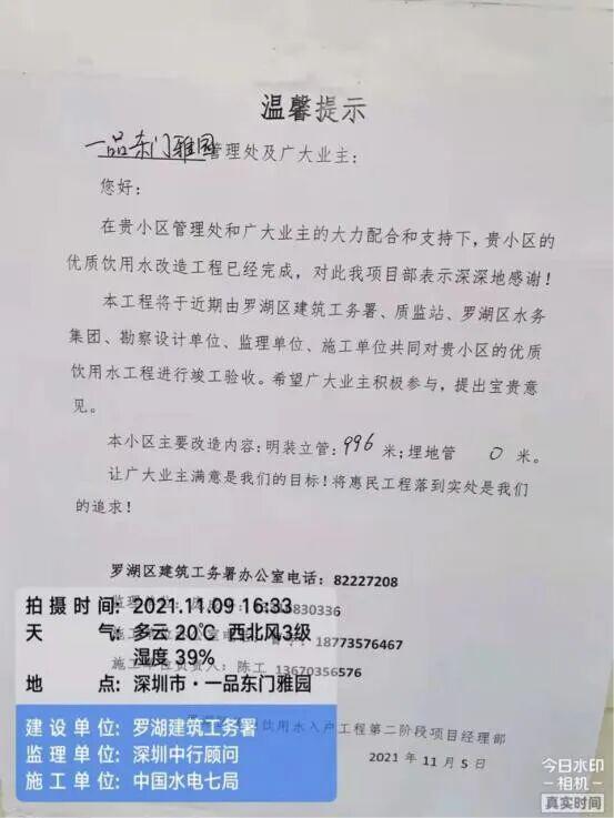 居民所提及的“优质饮用水项目”,是指“罗湖区优质饮用水入户工程”(下称“工程”),罗湖区建筑工务署在给记者的书面回复中表示,一品东门雅园确属工程第二阶段(第二批)范围,项目已于2021年底完工,2022年通过竣工验收。罗湖区水务集团也表示,一品东门雅园的外部供水管网已纳入优质饮用水体系,主干管和分表前水质均符合标准。